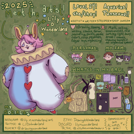 Hi! My name is Lily Davidson!I am currently 24 years old! I go by she/her + they/them pronouns and I am pansexual.I am an artist who does cartoon artwork and I love to do character concept artwork!If you want to be friends, feel free to message me on Discord or Instagram, I am always looking for new buddies, art related or not!